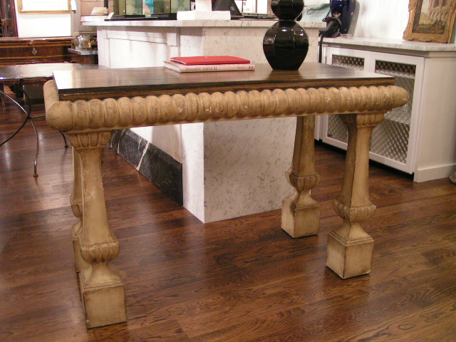Faux stone and wood table with striated top surface. Michael Taylor design. |